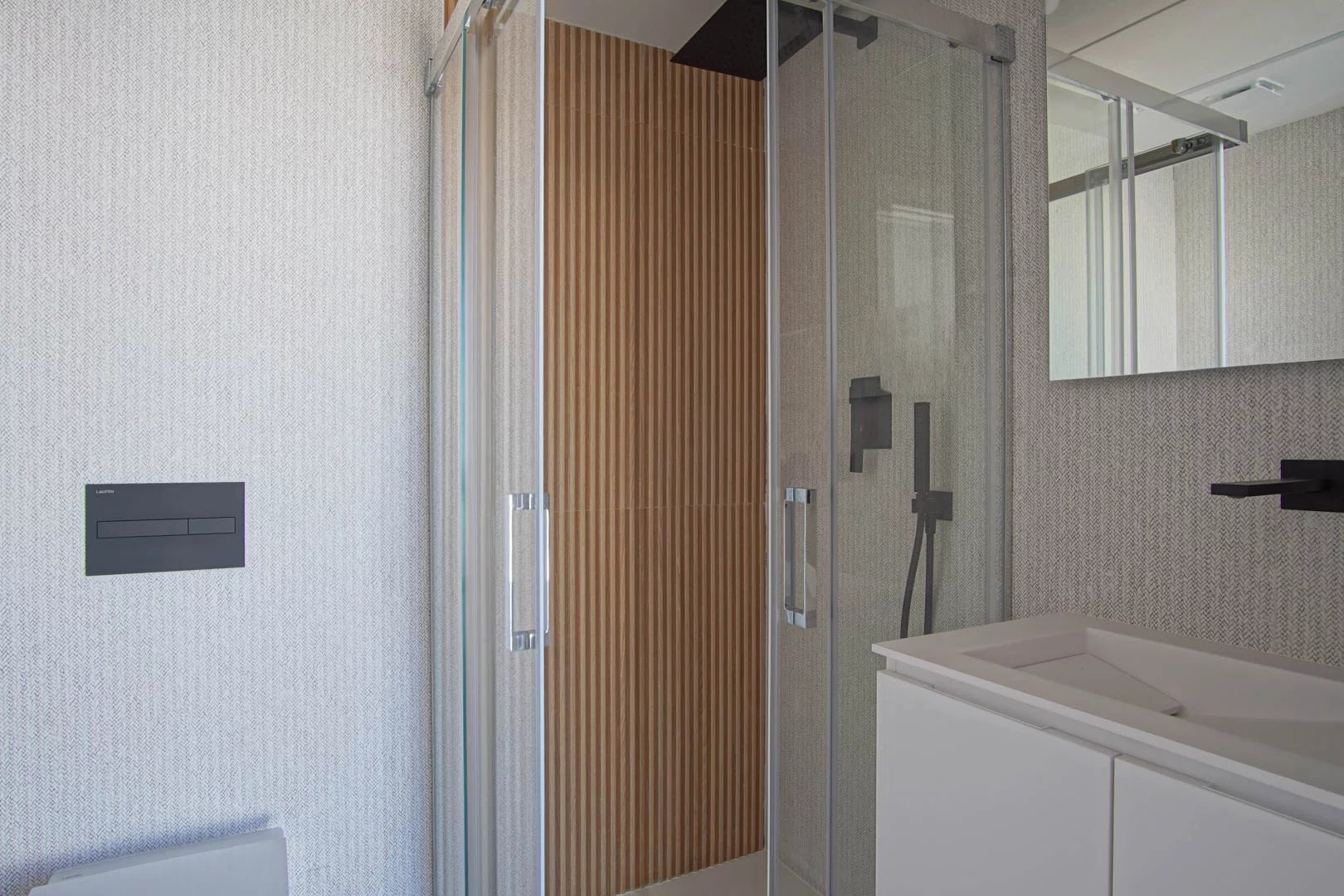 Bij binnenkomst treffen we een elegante woon-eetkamer aan met directe toegang tot een groot terras, ideaal om te ontspannen met uitzicht op zee. De moderne en praktische open keuken sluit naadloos aan op de woonkamer en biedt comfort en stijl. Het slaapgedeelte bestaat uit twee slaapkamers met inbouwkasten en een complete badkamer, evenals een master suite met een eigen badkamer en toegang tot een ander groot terras.